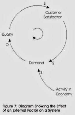 Dalam contoh kita di atas lingkaran menyeimbangkan kita berasumsi bahwa permintaan dibesarkan hanya sebagai pelanggan menjadi lebih puas. Pada kenyataannya permintaan hanya sebagai kemungkinan untuk terpengaruh oleh keadaan ekonomi. Ini ditampilkan dalam diagram dimodifikasi di bawah ini: